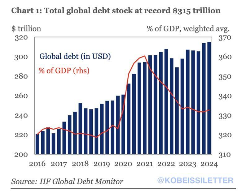 The imperative of the current economic model is growth, fueled by the creation of money that did not previously exist. Every issuance of debt is a promise to the future that the progressive amputation of limbs from the global body turned into money, will continue. And yet the global debt-to-growth ratio has been degrading for some time. More and more debt does not produce the growth it once did. Since 1980, the ratio of global debt ($303 trillion) to GDP peaked at 360% in 2021 and now stands at 335%.